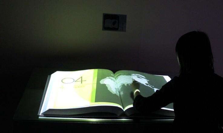 虛擬翻書,虛擬翻書實際上就是把信息內容投影到書型上,觀眾可以通過揮動手臂來達到翻書的效果,也可以選擇自己想讀的信息,既有科技感,又有大量的內存。