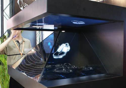 二是全息柜展示,全息柜常見的有270度和360度兩種,270度全息柜可以讓人們從三個側面觀看產品展示,360度全息柜可以全方位觀看,讓人們360度無死角地觀看,還可以有互動元素,成像效果立體直觀。