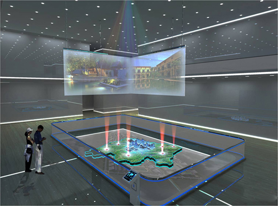 觀光地數字化沙盤的技術:三維動畫制作,多媒體展示技術,增強現實,投影裝置,體感控制系統等。